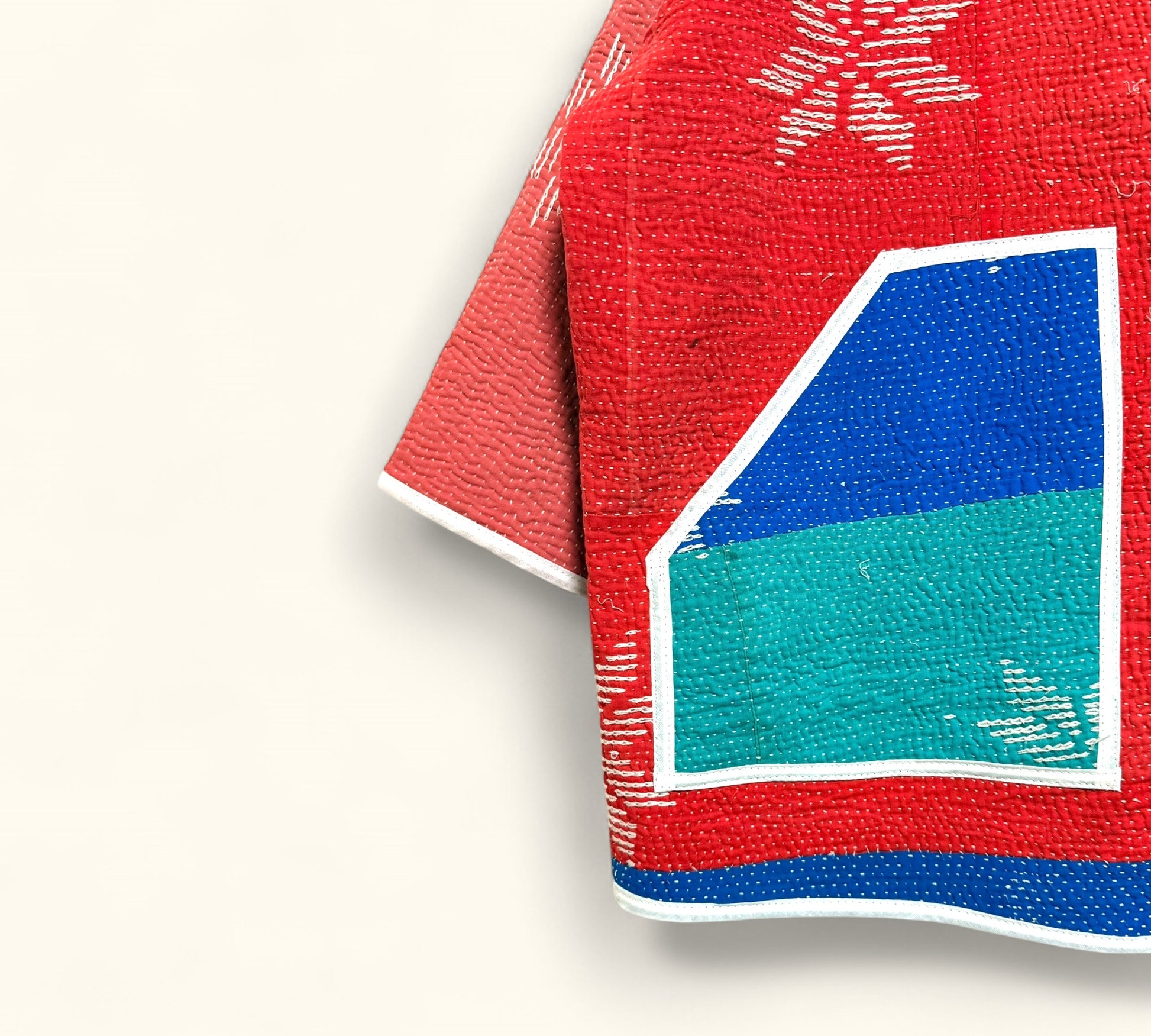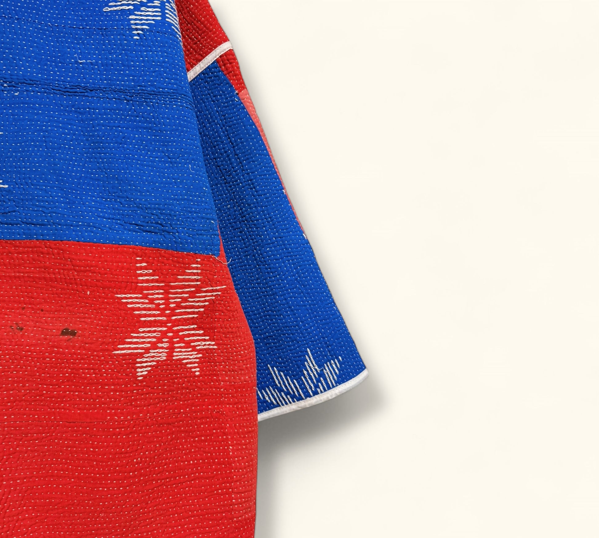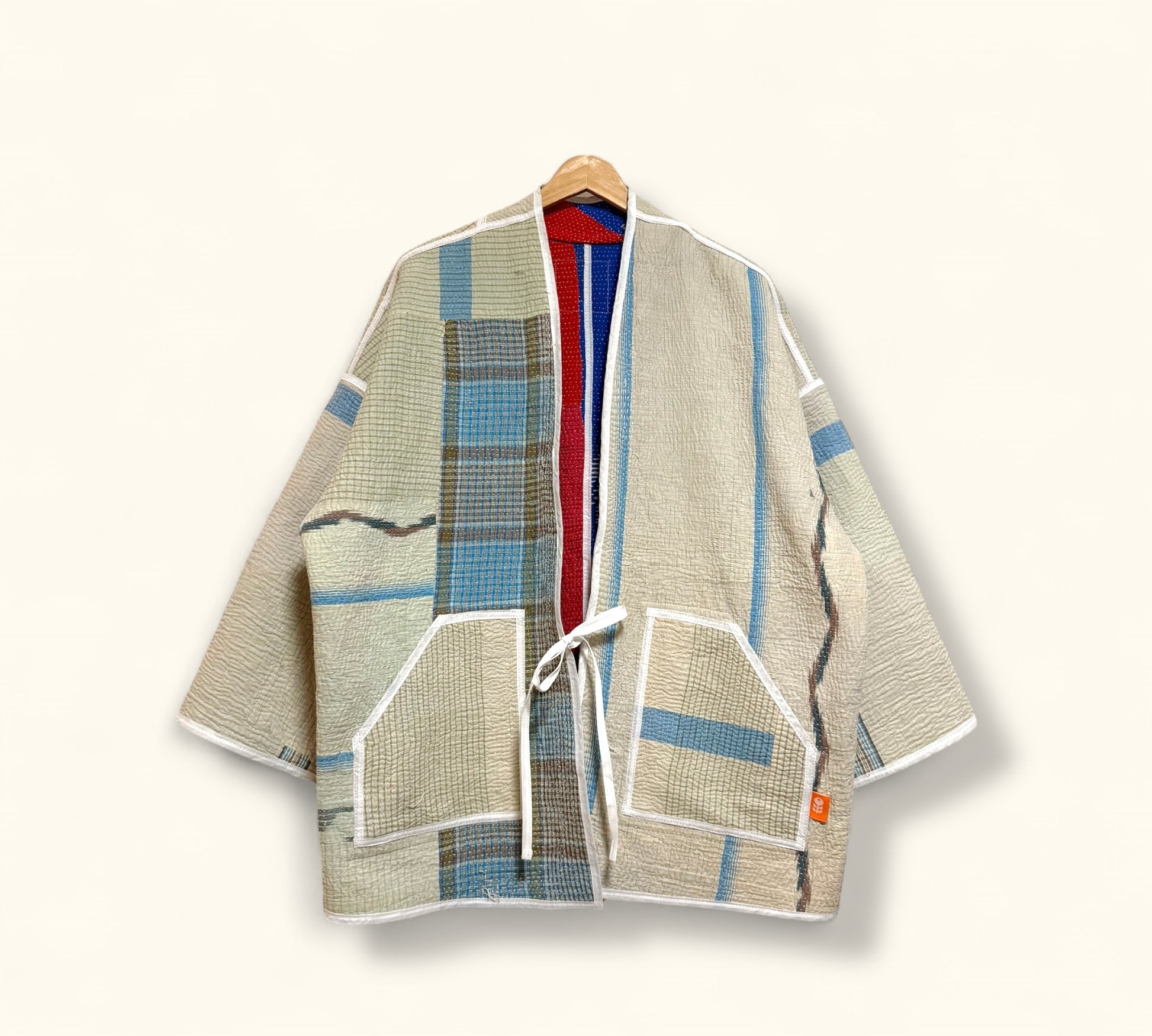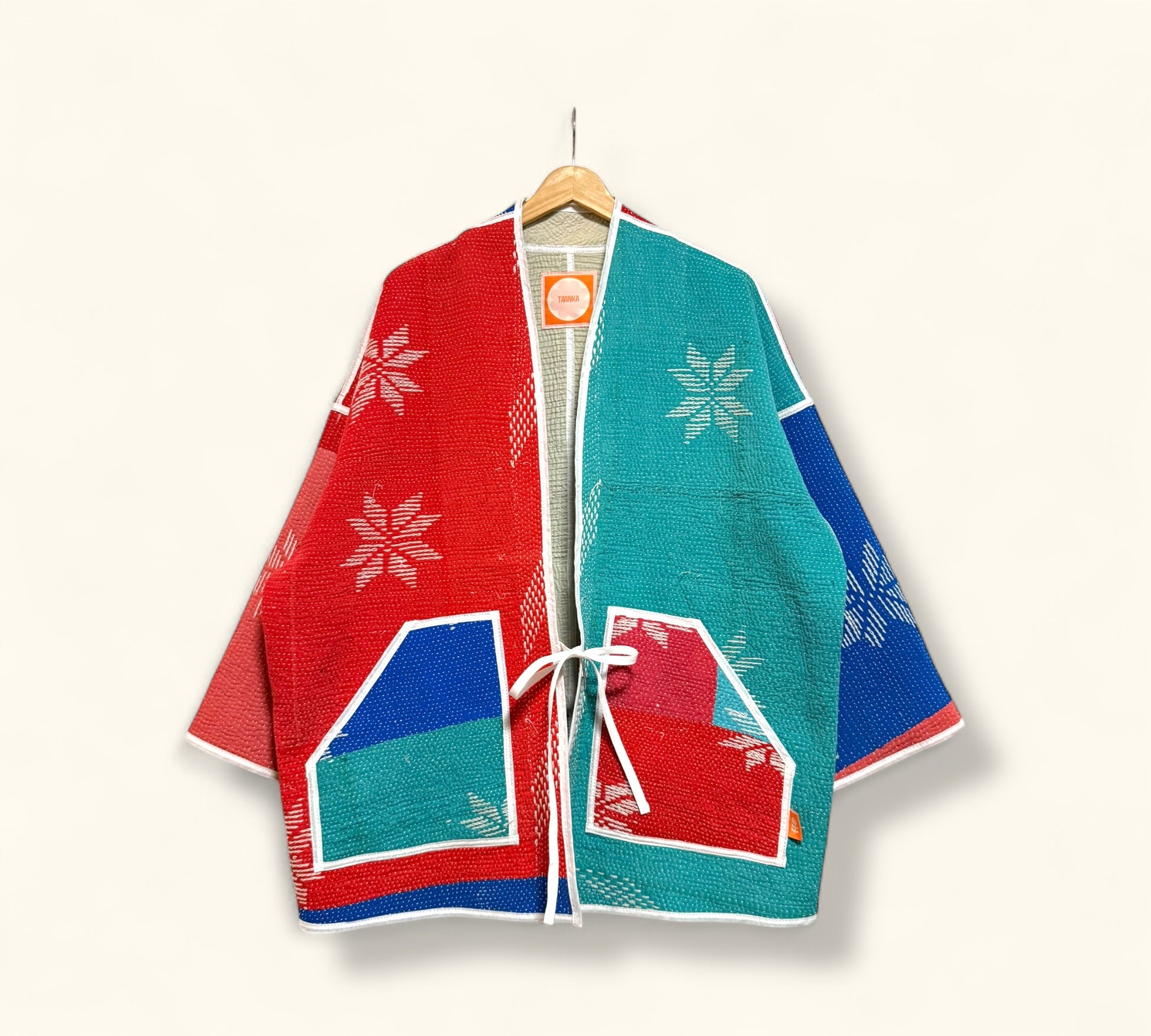 A distinctive characteristic of the kantha fabric is the decorative pattern on both sides making the jacket reversible.
