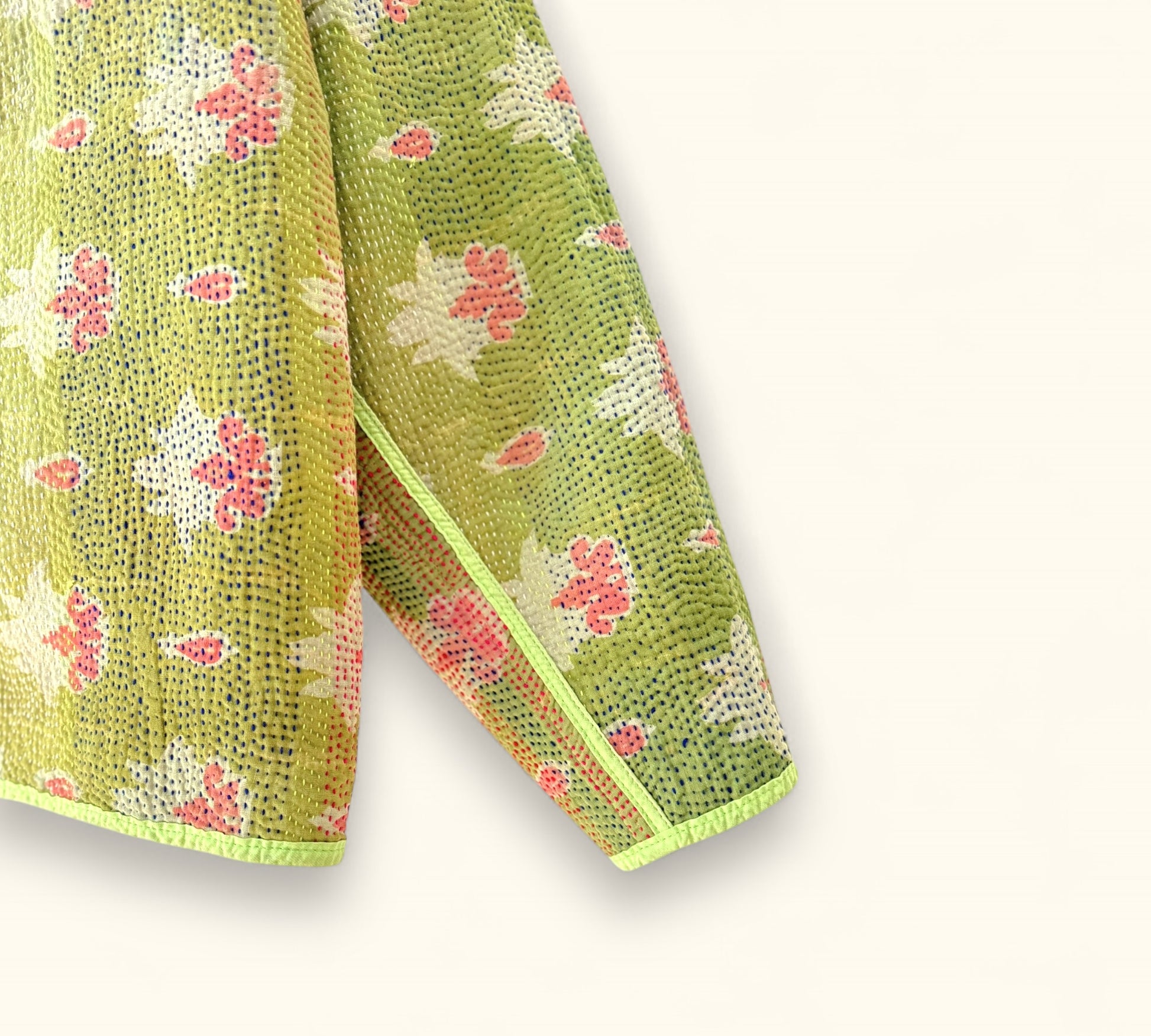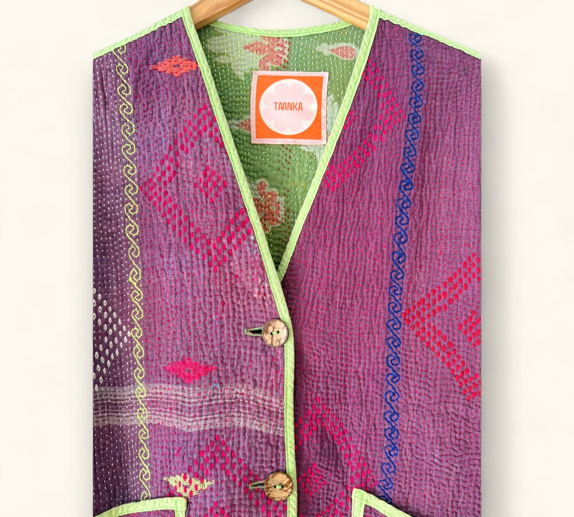 A distinctive characteristic of the kantha fabric is the decorative pattern on both sides making the jacket reversible.