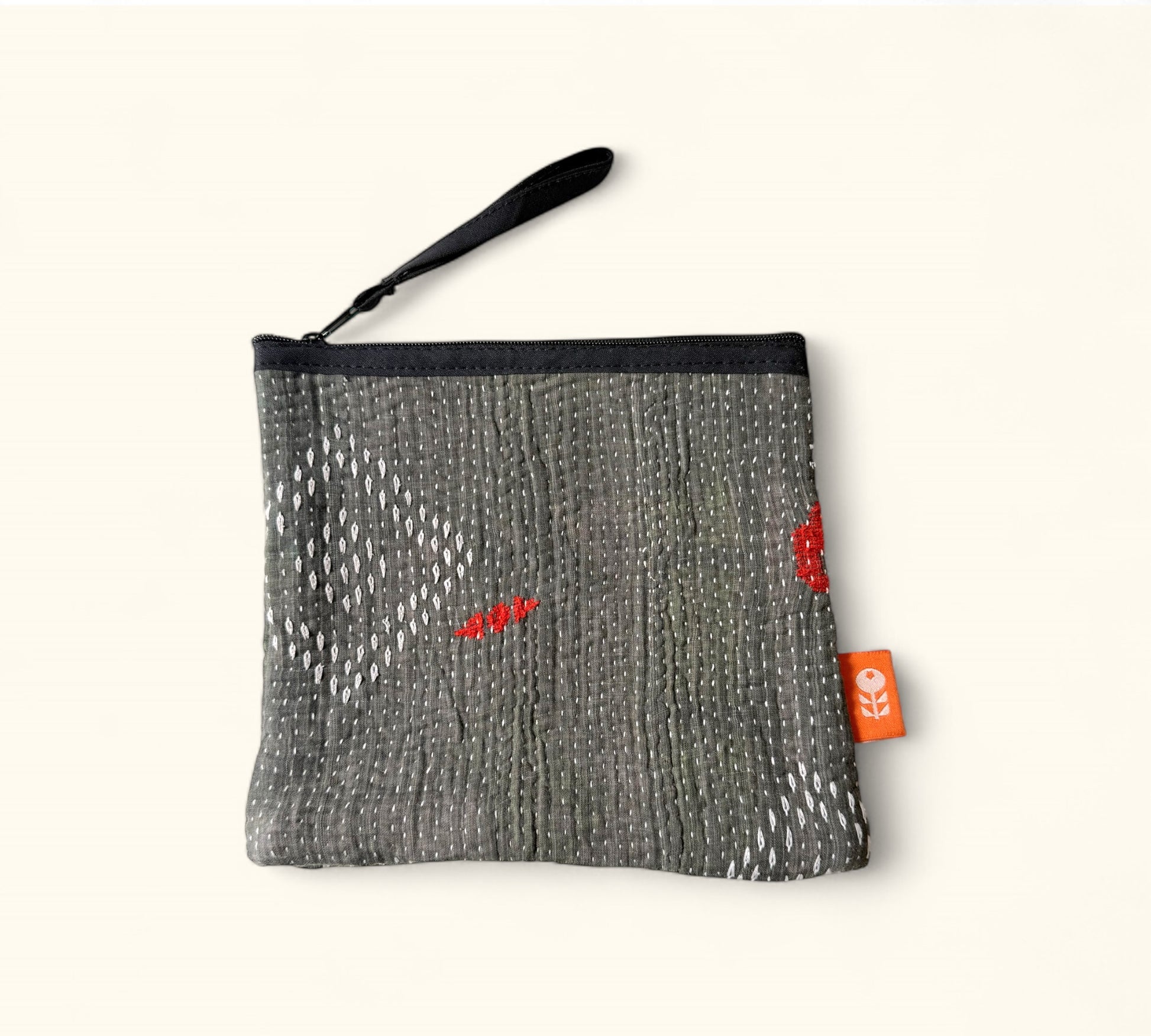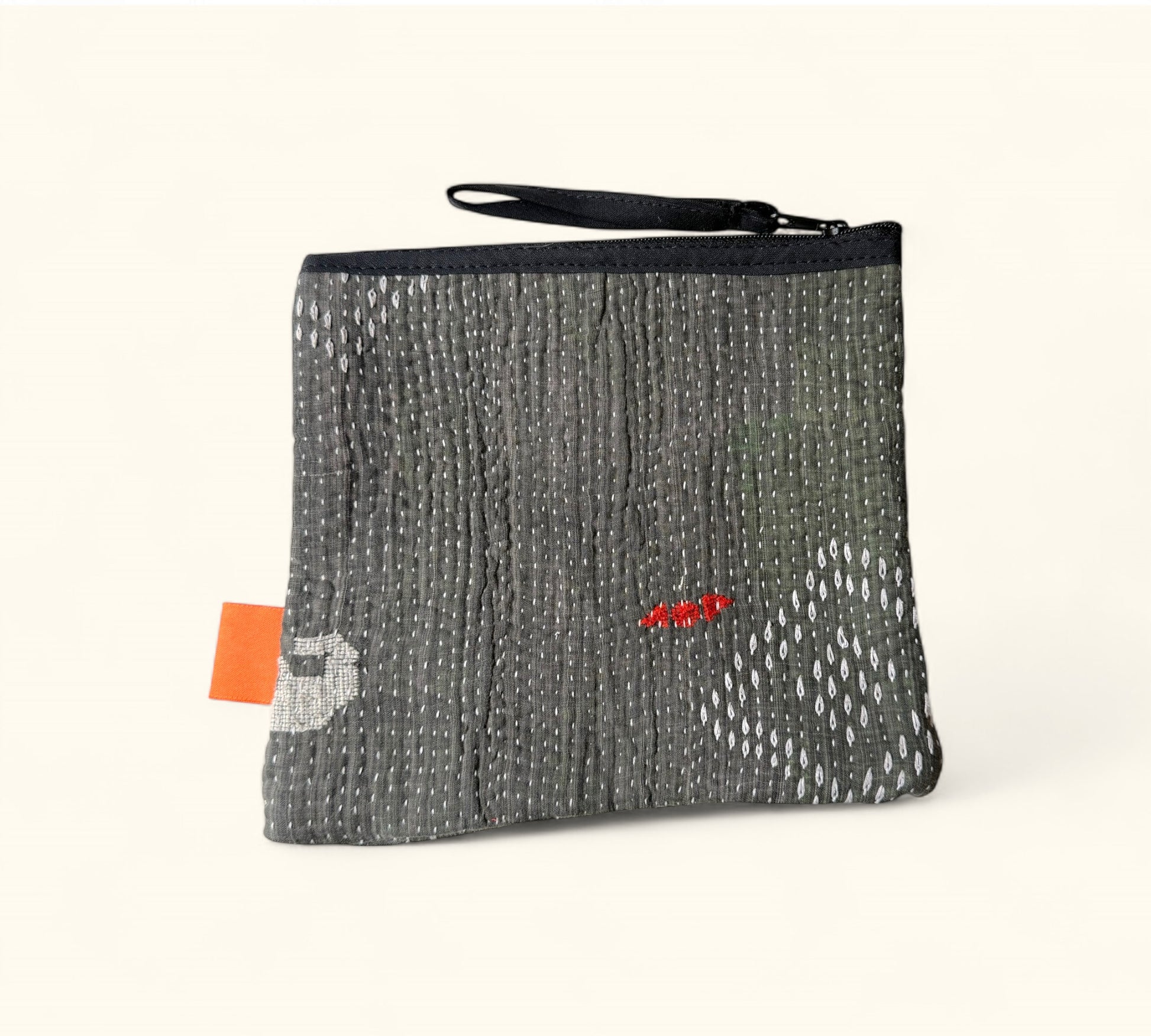 This unique pouch is crafted from vintage kantha, which is made of recycled layers of fabric that are woven together with vibrant coloured threads across the entire surface with thousands of tiny stitches. Creating unique and one-of-a-kind pieces, with delicate stitches that evoke the folklore of the Bengali region of India.