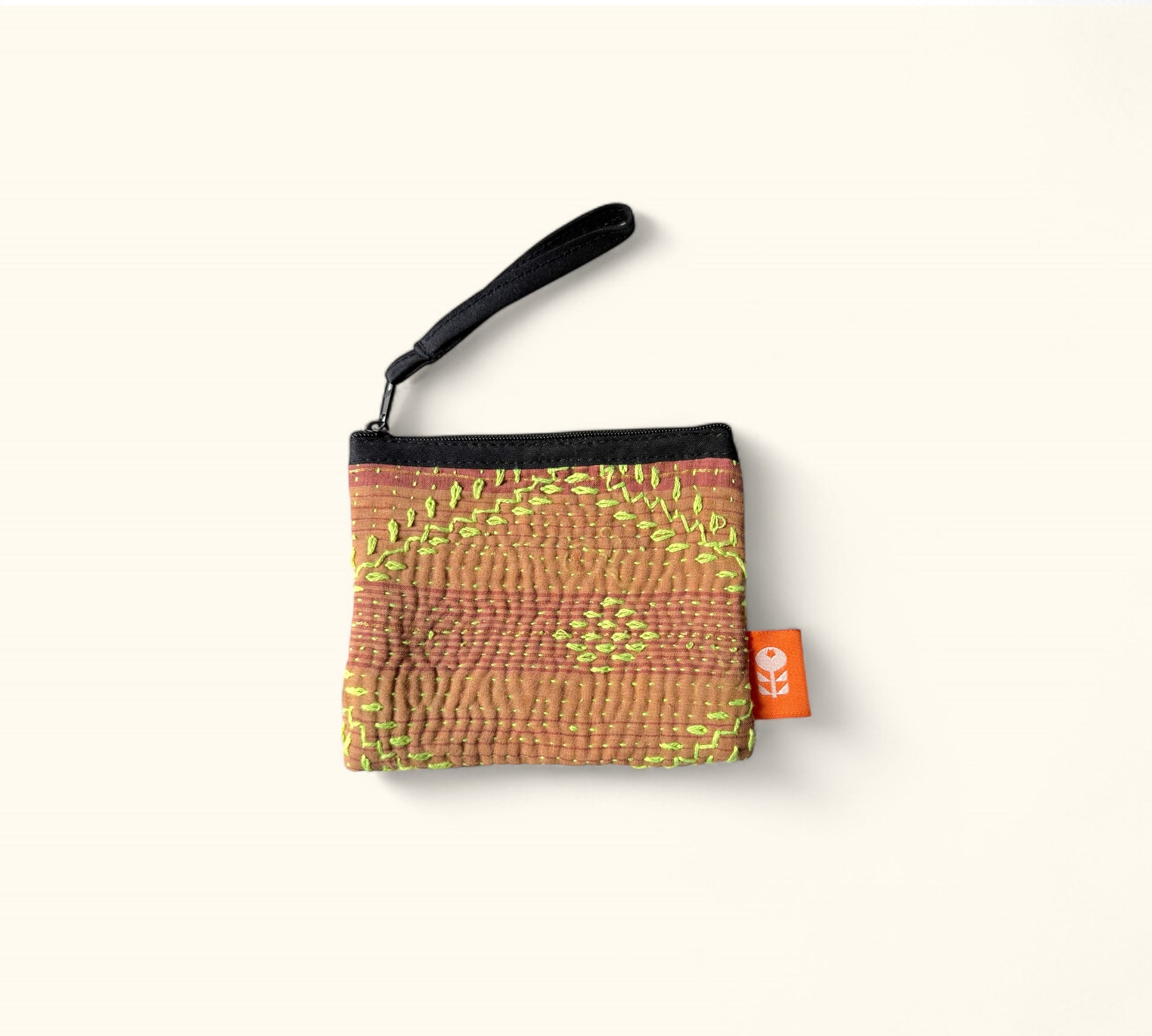 This unique pouch is crafted from vintage kantha, which is made of recycled layers of fabric that are woven together with vibrant coloured threads across the entire surface with thousands of tiny stitches. Creating unique and one-of-a-kind pieces, with delicate stitches that evoke the folklore of the Bengali region of India.